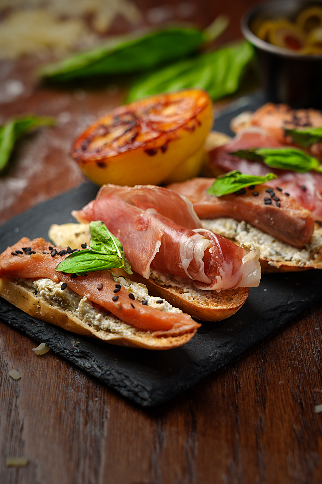 Pan artesanal (5) acompañado de queso de cabra, alcaparras, prosciutto, lajas de salmón curado, aceitunas negras y verdes.